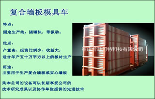 轻质隔墙板生产设备:实心墙板模具车产品特点1.自动化控制、动作可靠、装备技术成熟稳定可靠2.主题成型部分自动开合、自动调长、自动控稳加热、抽芯机行走、自动定位、芯管差